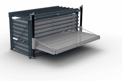 En ekstremt robust høykvalitets skuffesystem for oppbevaring av platemateriale, verktøy og andre produkter. Enheten har en stabil, sveiset konstruksjon, hvor produkter kan lagres sikkert. Enheten kan demonteres. De manuelt justerbare armene kan brettes. Hvis det er flere systemer plassert ved siden av hverandre, kan skinnene for guide-armene kobles sammen, slik at de kan betjene hvert system. Skuffene (100% uttrekkbare) er normalt av åpen konstruksjon, men de kan også bli dekket med stål eller tre. Systemet kan også leveres med en statisk øvre mesanin.