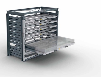 Enheten har en robust, sveiset konstruksjon som kan demonteres, som skyveskinnene er montert på. Skuffene er utstyrt med permanent smurte INA-rullelagre med en "livstidsforseglet" ekstra tykk ytre ring. Skuffene kan enkelt åpnes og lukkes manuelt.