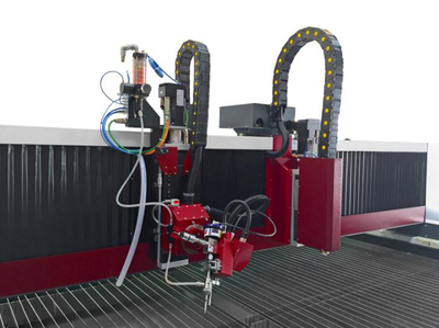 5 akset med vannskjærer- eller plasmaskjærerhoder (opsjon). Dobbel uavhengig motorisert akse for vannskjærer eller plasmaskjærer. Spesialtilpassede maskiner: Enkel eller dobbel Gantry Bridge, med flere hoder og flere kombinerte teknologier.